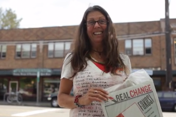 Susan Russell is a Real Change vendor and member of the Homeless Speakers Bureau. Image credit: Still capture from <a title="A Storytelling Project: Susan Russell on Vimeo" href="http://vimeo.com/92685423">video by Anissa Amalia</a>.